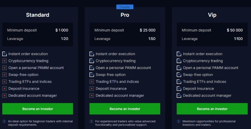 Торговля. Здесь предусмотрено несколько депозитов с порогом входа от 1000 до 50 000 долларов. Обещают моментальное исполнение ордеров, кредитное плечо до 1:100, отсутствие свопов, защиту и страховку аккаунта, большой выбор финансовых инструментов.